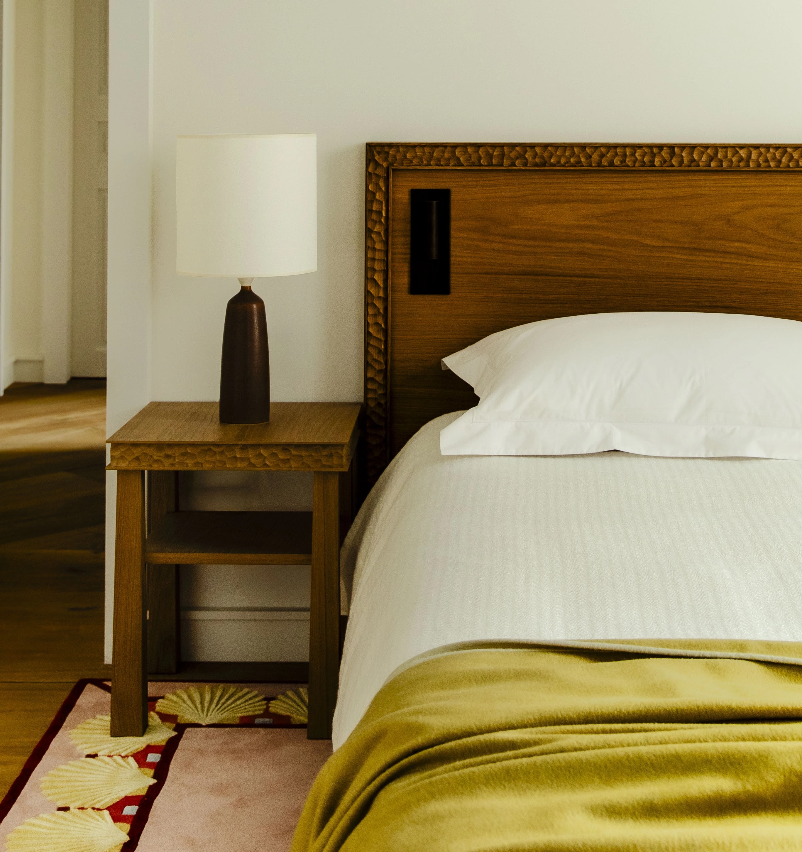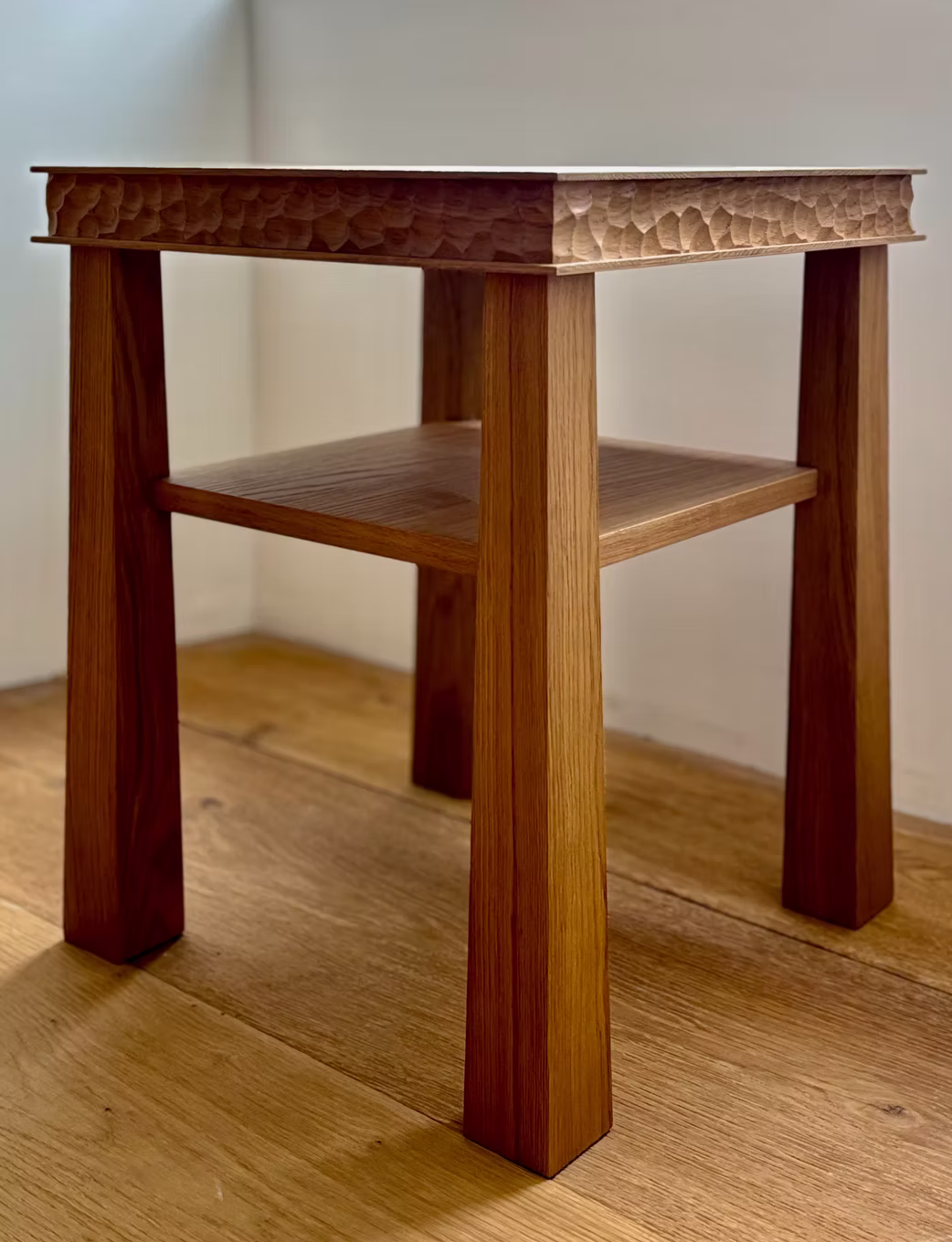 Cette table de chevet en chêne massif, assortie à la tête de lit, a entièrement été façonnée à la main. Le plateau carré présente des tranches ondulées en bois gougé, qui évoquent les mouvements doux de la surface de l'océan. Le bois brossé révèle le grain et la texture du chêne, offrant un toucher brut et naturel. Les pieds, solides et légèrement évasés, traversent le plateau et apportent une silhouette légère et équilibrée à l'ensemble.